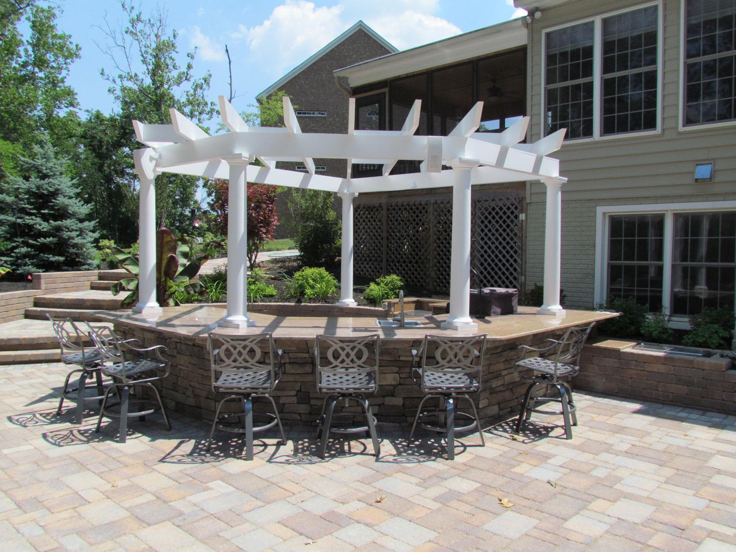 Outdoor Kitchens - Outdoor Kitchens are a nice add on feature for a patio. Each outdoor kitchen that we install is a customized for the client. The design and layout of the kitchen is important to meet the clients needs. A kitchen can be as simple as a grill and a counter top or it can include other features such as a fridge or sink. All outdoor kitchens should include night lighting, so the client doesn't have to hold a flash light while trying to flip burgers. Kitchens can be constructed out of retaining wall blocks with granite counter tops or they can be faced with stone for a more natural look.